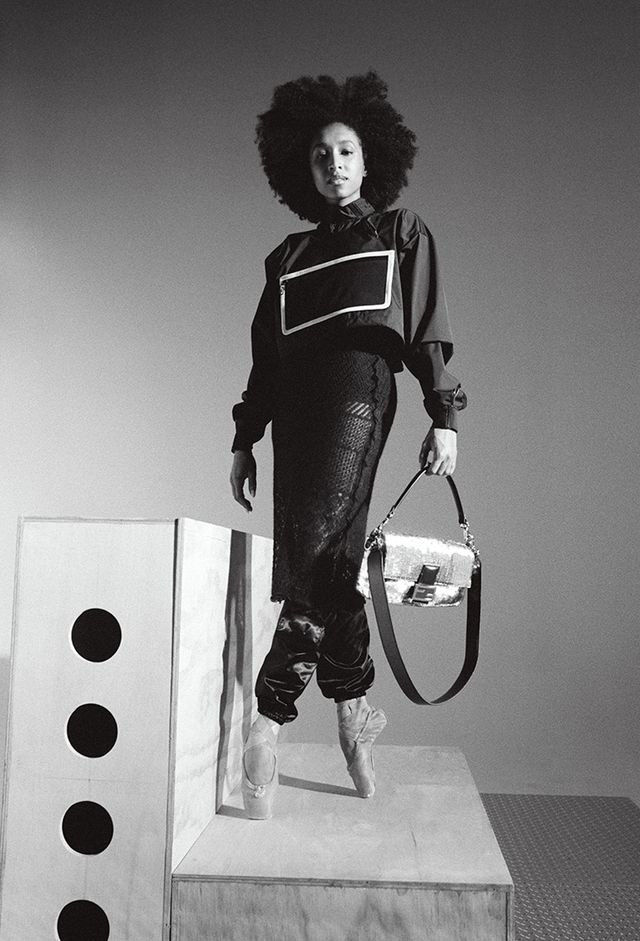 시어링 베스트, 드레스, 바게트 백, 플랫폼 로퍼는 모두 Fendi.
