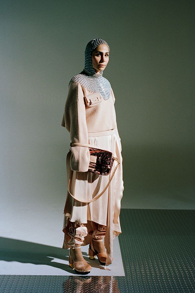 스웨터, 드레스, 바게트 포켓 디테일의 각반, 바게트 백, 클로그 슈즈는 모두 Fendi.