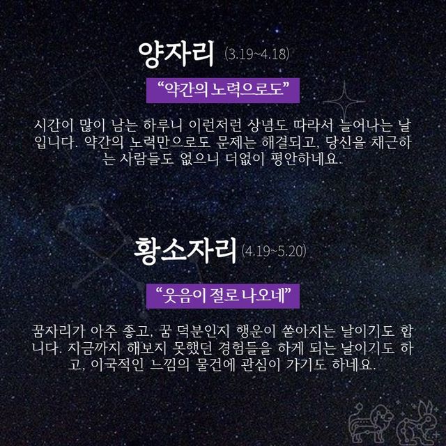 하루 내내 깔깔거릴 수 있는 날입니다. 약간의 실수를 하게도 되지만 주변 사람들이 좋게 봐주니 오히려 기분이 유쾌해지네요. 그리고 이러한 당신의 유쾌함은 주변 사람들에게로 전염되고요.