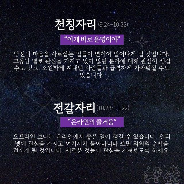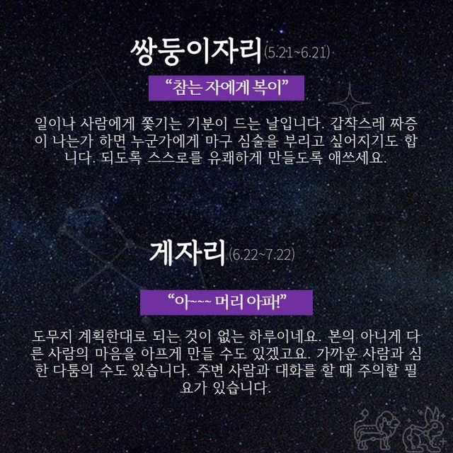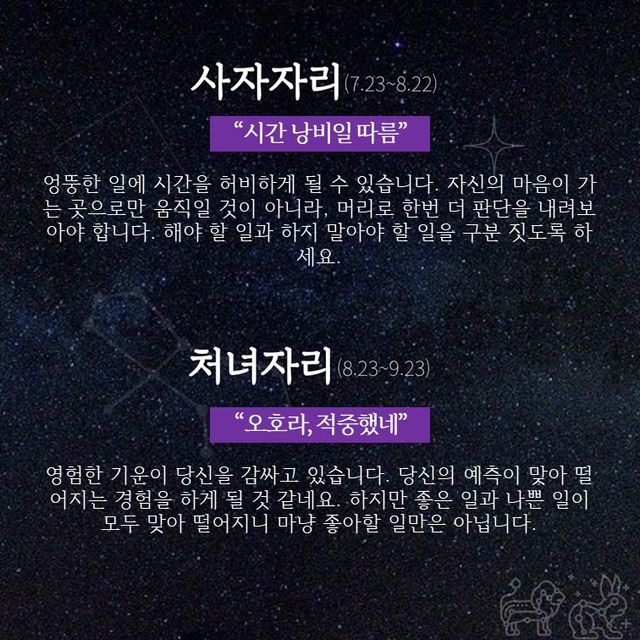 커플인 분의 경우 서로가 조금 멀어지는 느낌을 받을 수 있습니다. 상대가 당신에게 손을 내밀어주기를 기다리지 말고 먼저 손을 내밀 수 있도록 해야 합니다. 사랑은 자존심 대결이 아닙니다.