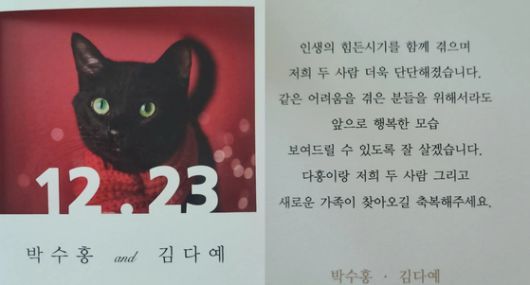 오는 23일 서울 모처에서 아내 김다예와 결혼하는 박수홍은 지난해 7월 혼인신고를 해 이미 법적 부부지만 웨딩마치를 울리지 못해 1년 5개월 만에 늦깎이 결혼식을 올리게 된 것. 여러 방송에서 아내에 대한 고마움과 미안함을 전하며 "꼭 면사포를 씌워주고 싶다"라는 의지를 보이기도 했다.