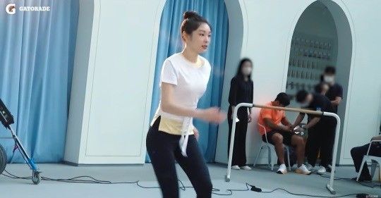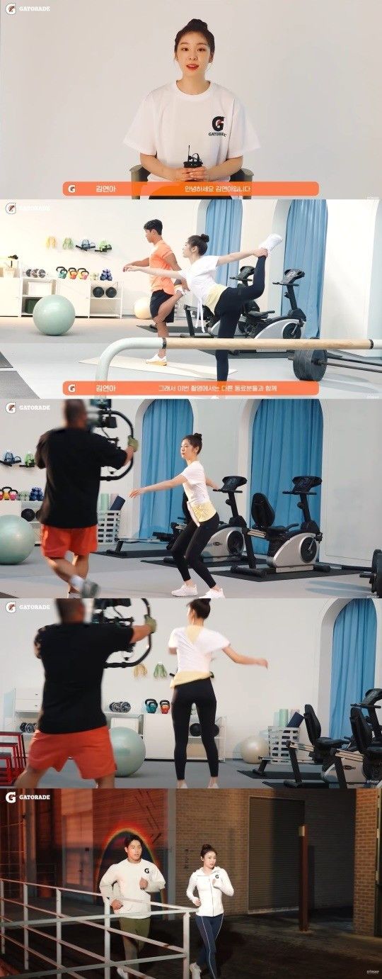 김연아는 피겨스케이팅 기술을 선보이기도 하고 달리기도 하며 열심히 촬영에 임했다.