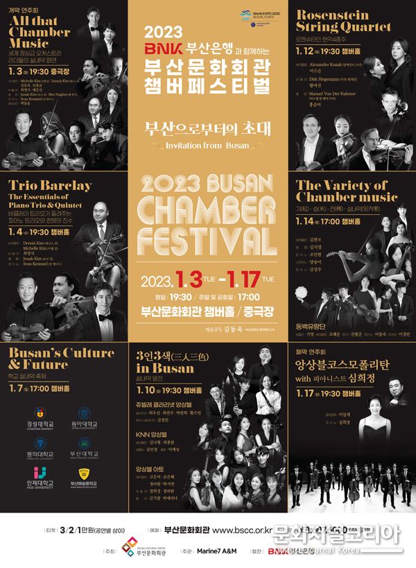 7일은 부산 문화의 미래인 경성대학교, 동아대학교, 동의대학교, 부산대학교, 인제대학교 실내악 팀들의 ‘부산의 future & culture 대학 실내악축제’가 부산문화회관 챔버홀에서 펼쳐진다. 올해는 특별히 부산을 넘어 한국의 K-클래식을 이끌어갈 부산예술중학교 실내악팀도 함께 연주한다.