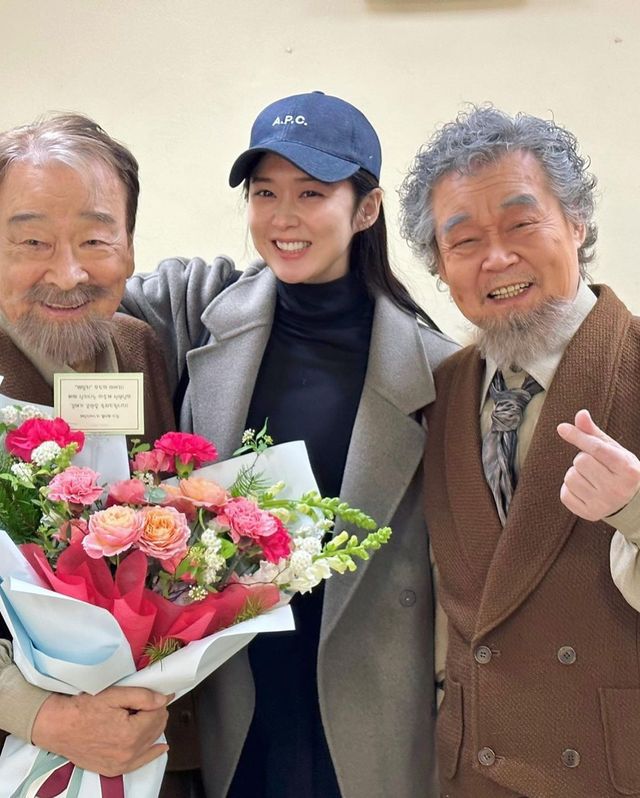 사진 속에는 이순재와 주호성 그리고 윤상정 사이에서 환하게 미소 짓는 장나라의 모습이 담겨 있다. 42세의 나이가 믿기지 않는 동안 외모가 눈길을 끈다.