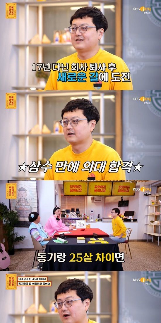 이날은 45세 곽영호가 사연자로 등장했다. 그는 "17년 다닌 회사를 그만두고 새로운 길을 찾기 위해 길을 옮겼다. 여긴 어린 친구들과 좀 같이 해야한다"며 마흔 넘어 공부를 해 의과대에 진학한 사실을 밝혔다.