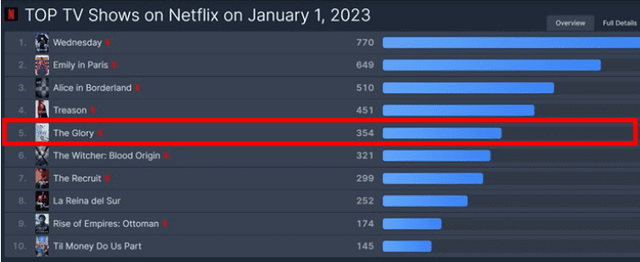 다만 ‘더 글로리’는 넷플릭스 공식 집계해 발표하는 주간 시청 시간 순위에는 아직 이름을 올리지 못한 상태입니다. 이 순위는 현재 지난해 12월19~25일 순위까지만 공개돼 있습니다. ‘더 글로리’의 시청 시간은 다음 기간 순위에서 확인할 수 있을 것으로 예상됩니다.
