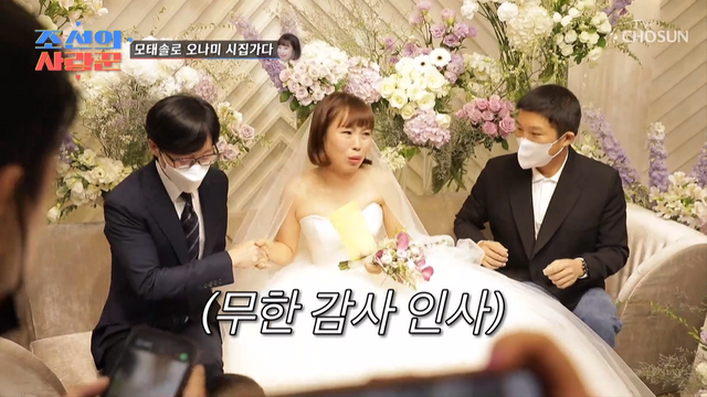 신랑 박민이 “나는 두 번 울 거라고 예상했는데 벌써 울어서 큰일났다”고 걱정하는 가운데 오나미는 개그우먼 선배 김지혜의 축의금을 받고 또 눈시울을 붉혔습니다. 오나미는 “연락을 못 드렸는데 준형 선배가 말씀하셔서 계좌로 못 가서 미안하다고”라며 김지혜에게 전화를 걸어 “오늘 잘 치르고 또 전화하겠다. 사랑한다. 감사하다”라고 감사 인사를 했습니다.