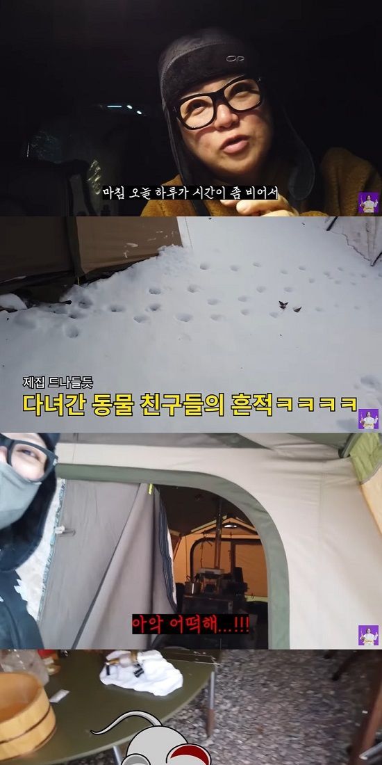 캠핑장에 도착한 김숙은 눈으로 가득 덮인 텐트 주변에서 다양한 동물들의 발자국을 발견했다.