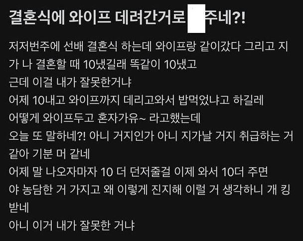선배는 결혼식 후 A씨에게 "10만원 내고 아내까지 데려와 밥 먹었냐"고 물었고, A씨는 "어떻게 아내 두고 혼자 가요"라고 웃으며 넘겼다는데요. 그런데 그다음 날에도 선배는 A씨에게 면박을 줬다고 합니다.