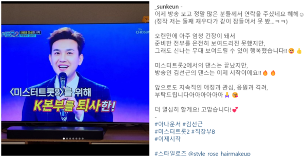 이어 "'미스터트롯2'에서의 댄스는 끝났지만, 방송인 김선근의 댄스는 이제 시작이다. 앞으로 지속적인 애정과 관심, 응원과 격려 부탁드린다. 더 열심히 하겠다"라는 각오를 다졌다.