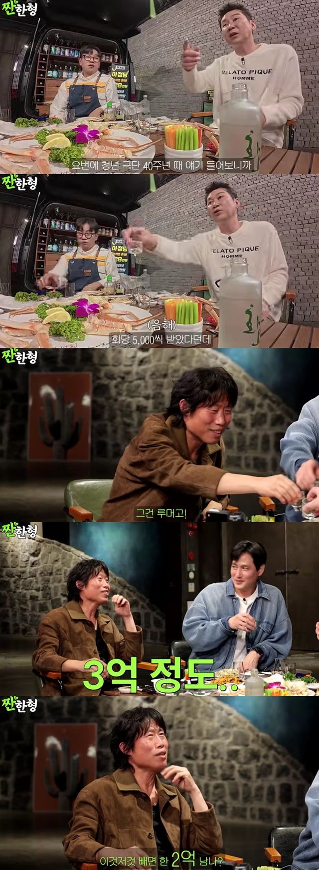 신동엽이 "청년 극단 40주년 때 얘기 들어보니까 회당 5,000만 원씩 받았다던데"라고 모함을 퍼트리자, 유해진은 "루머다"며 "3억 정도. 이것저것 빼면 한 2억 남나?"라고 너스레를 떨었다.