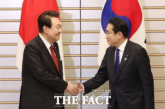 한일 정상회담 후폭풍이 이어지며 17일 하루 종일 여야 공방이 오갔다. 야당의 공세에 여당은 "미래를 위한 대승적 결단"이라고 맞섰다. 윤석열 대통령과 기시다 후미오 일본 총리가 지난 16일 도쿄 총리 관저에서 열린 한일 확대 정상회담에서 악수하는 모습. /뉴시스