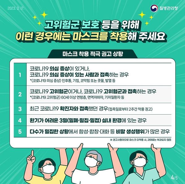 아울러 ▲코로나19 의심증상이 있거나 ▲의심증상이 있는 사람과 접촉하는 경우 ▲코로나19 고위험군 또는 고위험군과 접촉하는 경우 ▲최근 코로나19 확진자와 접촉했던 경우 ▲환기가 어려운 3밀(밀폐 밀집 밀접) 실내 환경에 있는 경우 ▲다수가 밀집한 상황에서 비말 생성행위가 많은 경우에서도 마스크 착용이 적극 권고된다.
