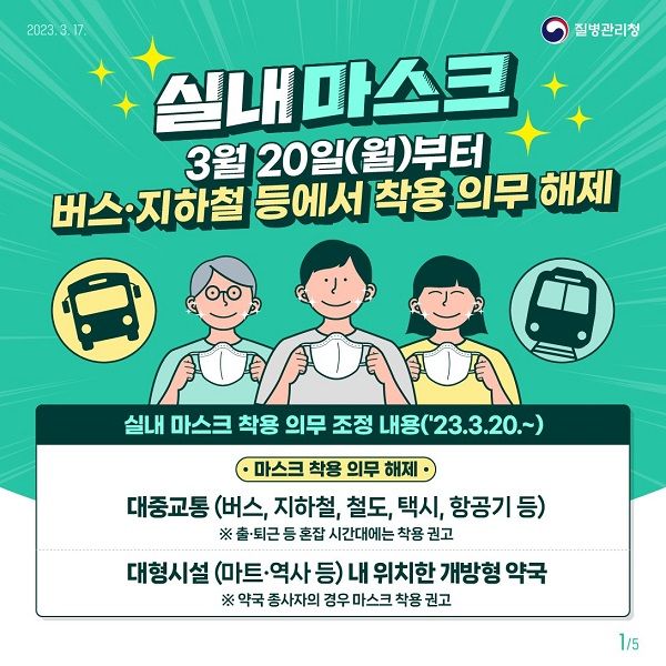내일부터 버스, 지하철, 철도, 택시, 항공기 등 대중교통과 마트, 역사 등에 위치한 개방형 약국에서는 마스크를 착용하지 않아도 된다.