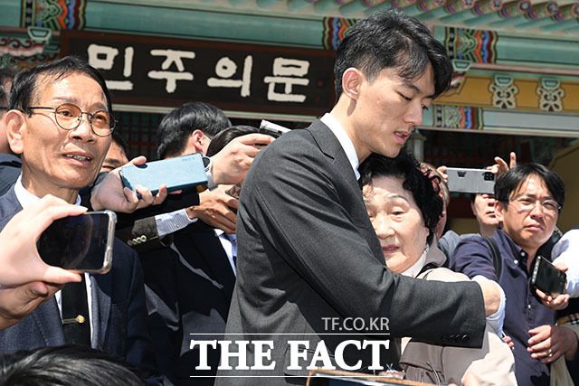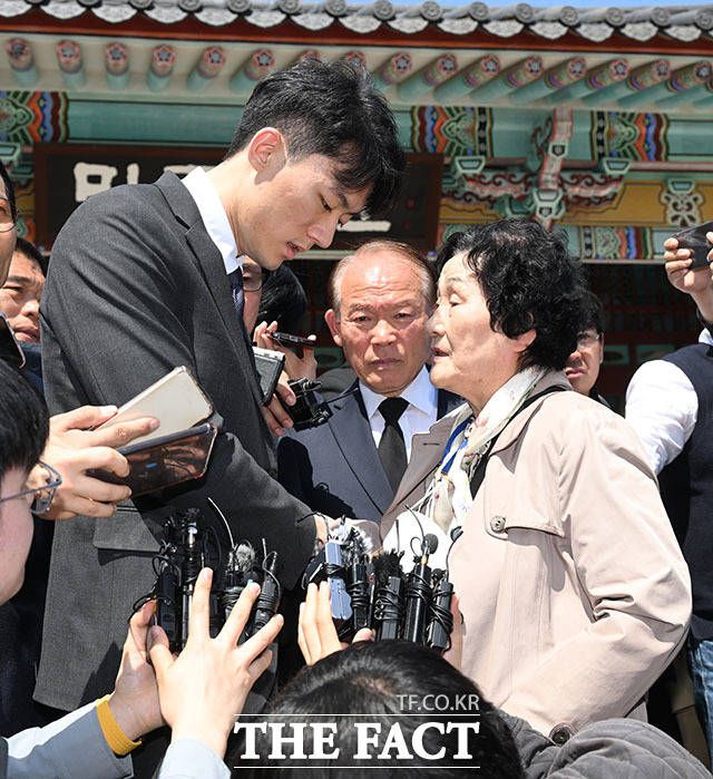 5.18민주화운동 피해자의 유가족 김길자 씨가 전우원 씨를 한번 안아주겠다며 전 씨에게 다가가고 있다.