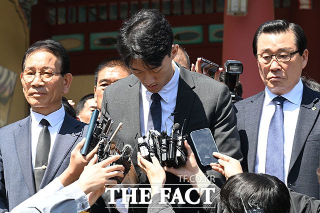 취재진 앞에서 고개숙인 채 답변하는 전우원 씨.