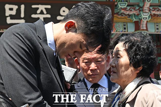 [더팩트ㅣ광주=남윤호 기자] 5.18민주화운동 피해자의 유가족 김길자 씨(오른쪽)가 31일 광주 북구 국립5.18민주묘지에서 참배를 마친 전두환의 손자 전우원 씨를 안아주고 있다.