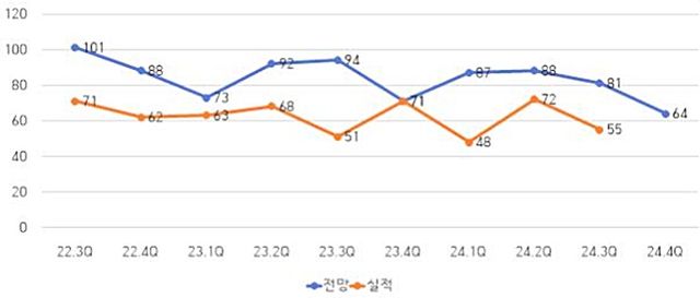 이는 지난 3분기에 이어 2분기 연속 하락세가 이어진 것으로, 이번 분기는 직전 분기보다 7p(88→81) 떨어졌던 3분기보다 하락 폭이 더 컸다.