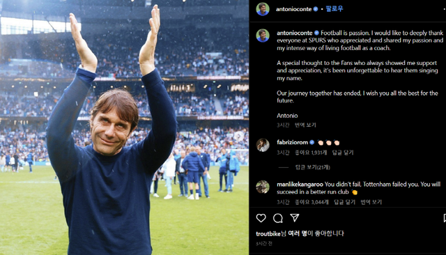 토트넘 홋스퍼 경기장에서 두 팔을 치켜들며 박수치는 모습의 사진을 가장 먼저 게재한 그는 "축구는 열정이다. 코치로서 내 열정과 축구를 위해 살아가는 내 방식을 이해해주고 공유한 '스퍼스(토트넘)' 모든 분들에게 깊은 감사를 드린다"며 "팬들의 응원과 사랑에 대해선 항상 특별하게 생각하고 있다. 내 이름 불러주던 것을 잊을 수 없다"고 인사했다.