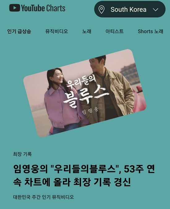 자체 최장 차트인 신기록. 임영웅이 부른 드라마 OST '우리들의 블루스' (이하 '우블')가 유튜브 주간 뮤직 비디오에서 20일 기준 53주 연속 차트인했다. /영웅시대