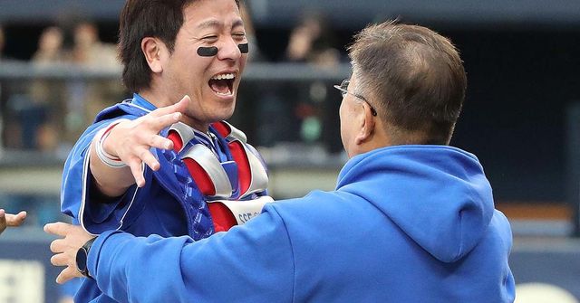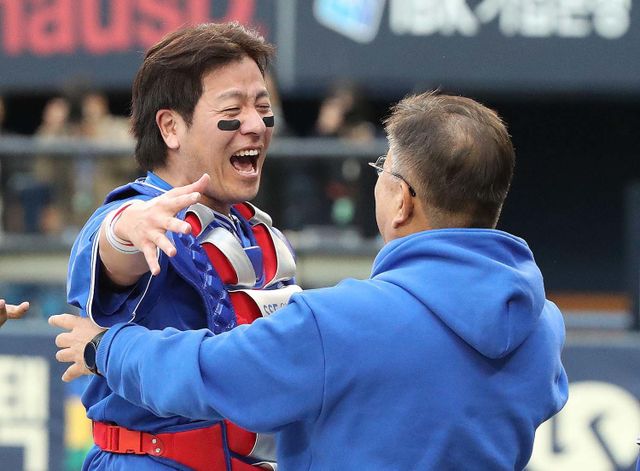 9일 오후 서울 송파구 잠실야구장에서 열린 프로야구 '2024 신한 SOL 뱅크 KBO 포스트시즌' 플레이오프 4차전 삼성 라이온즈와 LG 트윈스의 경기에서 승리하며 한국시리즈행이 확정된 삼성 강민호가 유정근 대표이사와 포옹을 하고 있다. 이날 경기는 삼성이 LG를 상대로 1-0으로 승리했다. / 뉴스1