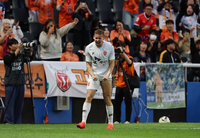 19일 K리그1 34라운드 인천과의 원정경기에서 선제골을 넣고 포효하는 제주 갈레고. 한국프로축구연맹 제공