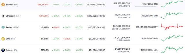 20일 가상자산 시황중계 사이트 ‘코인마켓캡’에 따르면 비트코인은 이날 오전 8시 20분 기준 24시간 전보다 0.01% 상승한 6만8342달러에 거래되고 있다. 지난 16일 6만8000달러를 찍은뒤 다시 상승세를 보이고 있다. 알트코인(비트코인을 제외한 가상자산)의 대표격인 이더리움은 같은 기준 2651달러로 0.4% 상승했다. 일주일 전과 비교하면 비트코인과 이더리움은 각각 8.06%, 6.9% 상승했다.