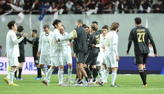 하지만 한국의 스타는 박지성이었다. 박지성이 전광판에 비친 순간, 경기장에선 그의 이름을 연호하는 목소리가 울려 퍼졌다. 특히 PK 득점 후에는 과거 PSV 에인트호벤(네덜란드) 시절 응원가인 ‘위송빠레’가 울렸다. 경기는 추가 시간 없이 종료됐지만, 박지성은 큰 박수를 받았다.