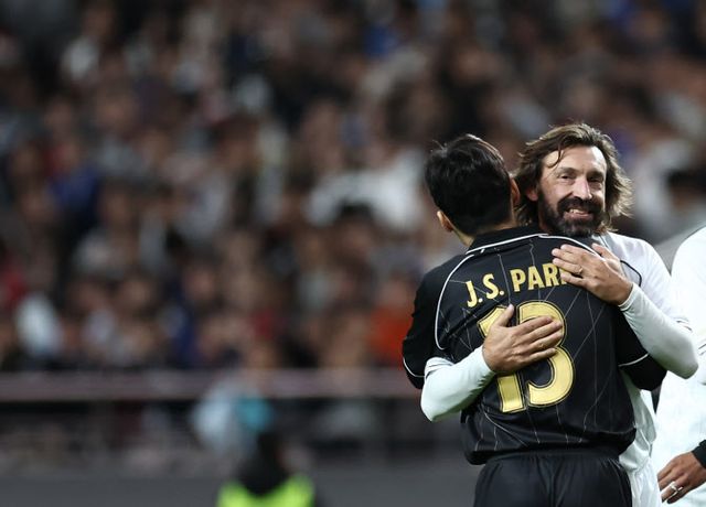 | 20일 오후 서울월드컵경기장에서 열린 2024 넥슨 아이콘 매치. 4-1 실드 유나이티드의 승리로 경기가 끝난 후 박지성과 피를로가 서로 인사를 나누고 있다. 사진=연합뉴스 |