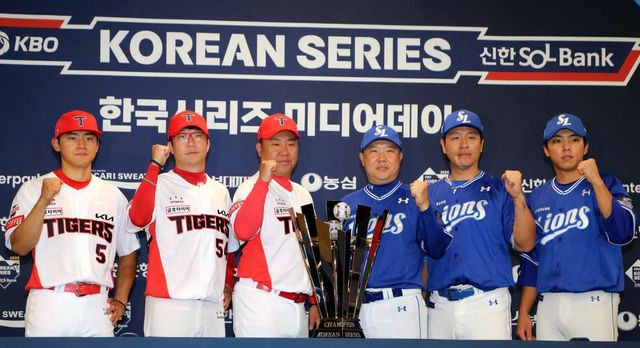 지난 20일 광주 라마다플라자 바이 윈덤 충장 호텔 라벤더홀에서 열린 신한 SOL뱅크 KBO 한국시리즈 미디어데이에서 양팀 감독과 선수들이 포즈를 취하고 있다. 사진 왼쪽부터 KIA 양현종, 김도영, 양현종, 이범호감독, 삼성 박진만 감독, 강민호, 김영웅. / 뉴스1