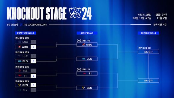 8강 1일 차와 2일 차에서는 LPL이, 3일 차와 4일 차에서는 LCK가 각각 승리하면서 이번 월드 챔피언십의 결승전은 LPL과 LCK의 대결로 확정됐다. 웨이보 게이밍과 빌리빌리 게이밍의 대결은 오는 26일, T1과 젠지의 맞대결은 27일 프랑스 파리에 위치한 아디다스 아레나에서 5전 3선승제로 펼쳐진다.