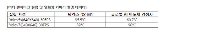 반면, 경쟁사 제품은 동일 조건에서 버터가 빠르게 녹아내리며 발열 관리의 한계를 드러냈다. 더 복잡한 Yolov7 알고리즘에서도 DX-M1은 경쟁 제품을 20~40도 낮은 온도로 압도하는 성능을 입증했다.