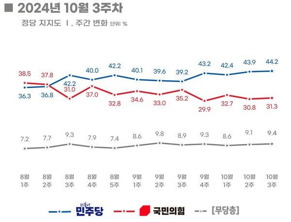 정당 지지율은 더불어민주당 44.2%(0.3%P↑), 국민의힘 31.3%(0.5%P↑), 조국혁신당 7.4%(1.9%P↓), 개혁신당 4.6%(0.8%P↑)로 나타났다. 민주당은 TK와 PK에서도 국민의힘과 오차범위 내 지지율을 기록하는 등 지난 4월 총선 직전인 4월 1주차(44.6%) 이후 최고치를 기록했다.