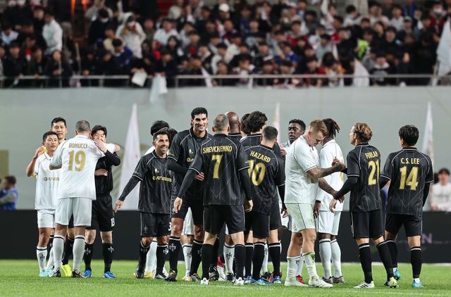 20일 오후 서울 마포구 서울월드컵경기장에서 열린 '2024 넥슨 아이콘매치' FC 스피어와 실드 유나이티드의 경기, 실드 유니이티드의 4대1 승리 후 양팀 선수들이 인사를 나누고 있다. / 뉴스1
