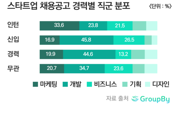 경력별 채용 직군 비율은 인턴, 신입, 경력, 경력 무관으로 구분했다. 인턴 채용공고 중 채용 직군 비율은 마케팅 직군이 33.6%로 가장 높았다. 다음으로 개발 직군(23.8%), 비즈니스 직군(21.5%), 기획 직군(11.7%), 디자인 직군(9.4%) 순이었다. 신입 채용공고 중 채용 직군 비율은 개발 직군이 45.8%로 가장 많은 비율을 차지했다. 비즈니스 직군은 26.5%, 다음으로 마케팅 직군(16.9%), 기획(6%), 디자인(4.8%) 등이 뒤따랐다. 경력 채용공고 중 채용 직군 비율은 신입과 동일하게 개발 직군이 44.6%로 가장 많았다. 경력 채용공고에서 두 번째로 높은 비율을 차지한 직군은 마케팅으로(19.9%) 나타났다. 경력 채용공고에서는 비즈니스 직군(13.2%), 기획 직군(11.7%), 디자인 직군(10.6%)인 반면, 경력 무관 채용공고에서는 비즈니스 직군이 23.6%로 두 번째로 높은 비율을 차지했다. 경력 무관 채용공고에서 개발 직군은 34.7%를 차지했고, 마케팅 직군 20.7%, 디자인 직군(10.9%), 기획 직군(10.2%)로 나타났다.