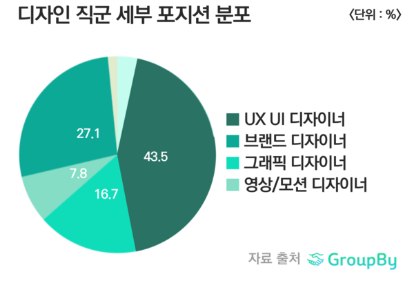 디자인 직군은 UX UI 디자이너가 43.5%로 가장 높은 비중을 차지했다. 다음으로 브랜드 디자이너(27.1%), 그래픽 디자이너(16.7%), 영상/모션 디자이너(7.8%) 순이었다.
