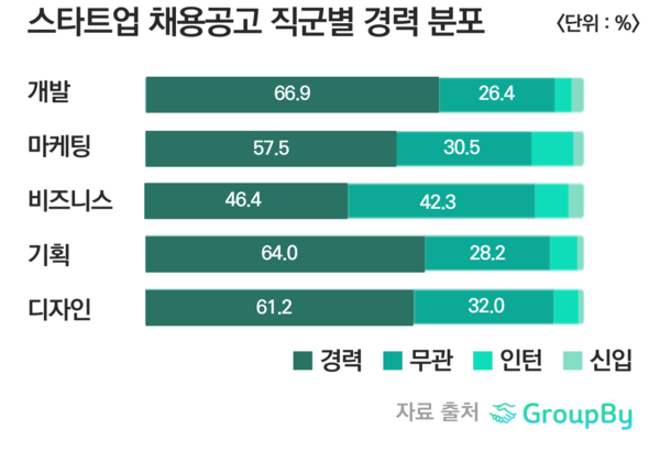 직군별 채용공고의 경력별 비율은 다음과 같았다. 개발 직군의 채용공고 중에서는 경력 채용이 66.9%로 가장 높았고, 경력 무관(26.4%), 인턴(3.6%), 신입(3%) 순이었다. 마케팅 직군의 채용공고 중에서는 경력 채용(57.5%), 경력 무관(30.5%), 인턴(9.7%), 신입(2.3%) 순으로 나타났다. 비즈니스 직군 채용공고는 경력 채용의 비율이 46.4%로 가장 높았지만, 경력 무관 채용 비율도 42.3%를 차지했다. 그 외 인턴(7.6%), 신입(3.6%) 등이 뒤따랐다. 기획 직군 채용공고 중 경력 채용이 64%로 개발 직군 다음으로 경력 채용의 비율이 가장 높은 직군으로 밝혀졌다. 다음으로 경력 무관(28.2%), 인턴(6.4%), 신입(1.5%) 등이 뒤따랐다. 디자인 직군 채용공고도 경력 채용 비율이 61.2%로 가장 높았다. 경력 무관 채용은 32%로 비즈니스 직군 다음으로 경력 무관 채용 비율이 높은 직군으로 나타났다. 인턴 채용은 5.5%, 신입 채용은 1.3%에 그쳤다.