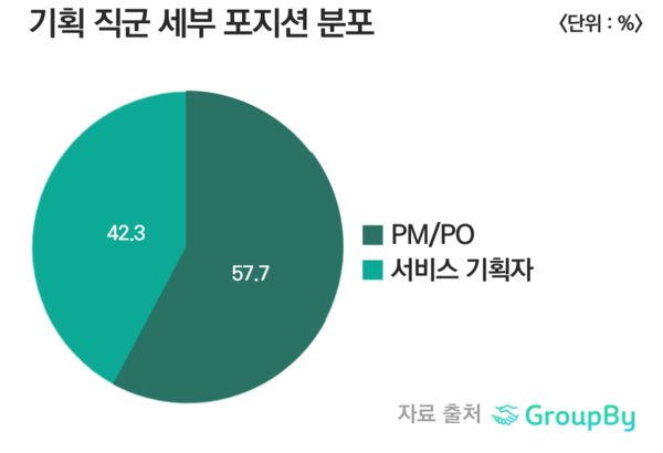 기획 직군은 프로덕트 단위로 오너십을 가지게 되는 PM/PO의 비율이 57.7%, 서비스 기획자의 비율이 42.3%로 나타났다.