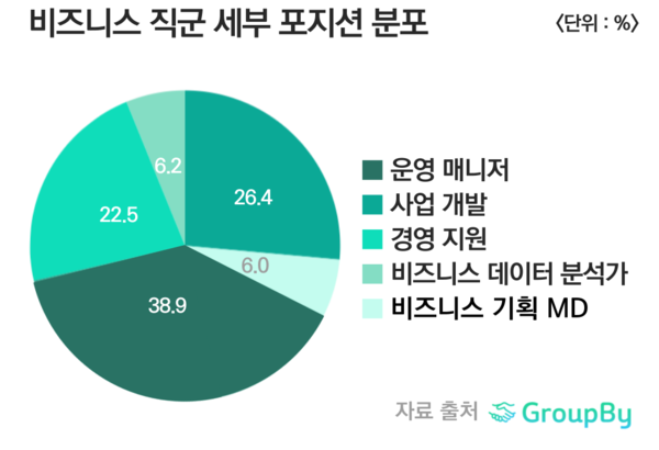 비즈니스 직군은 세부 포지션 중 약 40%를 운영 매니저가 차지하는 것으로 드러났다. 다음으로 사업 개발(26.4%), 경영 지원(22.5%), 비즈니스 데이터 분석가(6.2%), 비즈니스 기획 MD(6%) 순이었다.