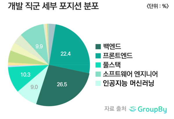 개발 직군은 세부 포지션 중 절반에 해당하는 비율이 백엔드 (26.5%), 프론트엔드(22.4%)로 나타났다. 인공지능 스타트업이 늘면서 인공지능에 관한 채용도 늘어났지만, 여전히 플랫폼 구성의 주축을 담당하는 풀스택(10.3%), 소프트웨어 엔지니어(9.9%) 채용 비율도 인공지능 · 머신러닝(9%) 만큼 높았다. 데이터 엔지니어는 전체 개발 직군 중 4.8% 비율을 차지했다.