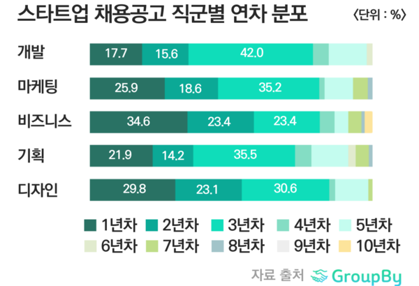 채용 연차별 채용 직군의 비율은 다음과 같았다. 최소 연차 기준으로 1년 차 채용공고 중에서는 개발 직군(38%), 마케팅 직군(20.4%), 비즈니스 직군(18.9%), 기획 직군(10.6%), 디자인 직군(10.3%) 순이었다. 2년차 채용공고는 개발 직군(35.2%), 마케팅 직군(23.1%), 비즈니스 직군(17.8%), 디자인 직군(14.6%), 기획 직군(9.3%) 순이었다. 전 직군에서 채용 비율이 압도적으로 높았던 3년 차는 채용공고 중 개발 직군이 47.8%로 가장 높았다. 다음으로 마케팅 직군(21.8%), 기획 직군(11.7%), 디자인 직군(9.7%), 비즈니스 직군(9%) 등이 뒤따랐다. 4~5년 차 채용공고 중에서도 개발 직군이 49.5%로 가장 많은 비율을 차지했다. 그 외 마케팅 직군(17.2%), 기획 직군(14.2%), 디자인 직군(9.8%), 비즈니스 직군(9.3%) 순이었다. 6~8년 차 채용공고는 개발 직군(38.8%), 마케팅 직군(26.3%), 기획 직군(16.3%), 비즈니스 직군(13.8%), 디자인 직군(5%) 순으로 나타났다. 최소 연차 9~10년 이상을 원하는 채용공고 중에서는 개발 직군이 33.3%로 가장 높았다. 마케팅 · 비즈니스 직군은 27.8%로 같은 비율을 차지했다. 그 외 기획 직군은 11.1% 비율로, 디자인 직군은 최소 9년 차 이상을 원하는 채용공고가 없는 것으로 나타났다.