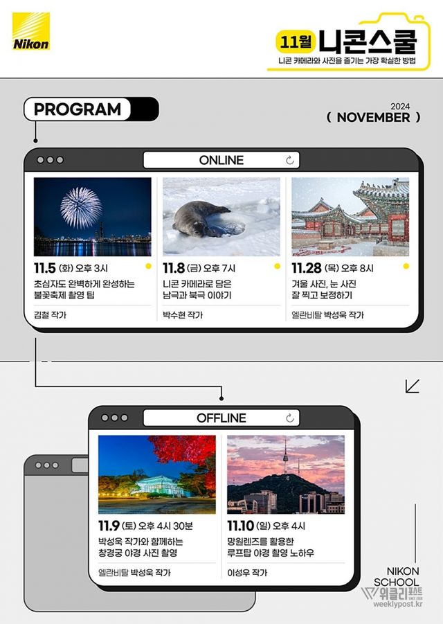 온라인 강의는 니콘이미징코리아 공식 유튜브 채널을 통해 무료로 수강 가능하며, 오프라인 강의는 사전 신청을 통해 참여할 수 있다. 특히, 11월 5일에는 초심자도 쉽게 따라할 수 있는 불꽃축제 촬영팁을 시작으로, 8일에는 북극과 남극의 촬영 경험을 공유하고, 28일에는 겨울 사진 촬영과 보정법을 배울 수 있다.