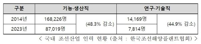 향후 2027년까지 기술인력이 1만3000명 이상 필요할 것으로 예상되고 있으나 불황 때 조선소를 떠난 내국인 근로자들, 고급기술자들은 돌아오지 않고 있는 상황이다. 타 산업대비 상대적으로 낮은 임금, 힘들고 열악한 노동환경 등이 원인으로 지적되고 있다.