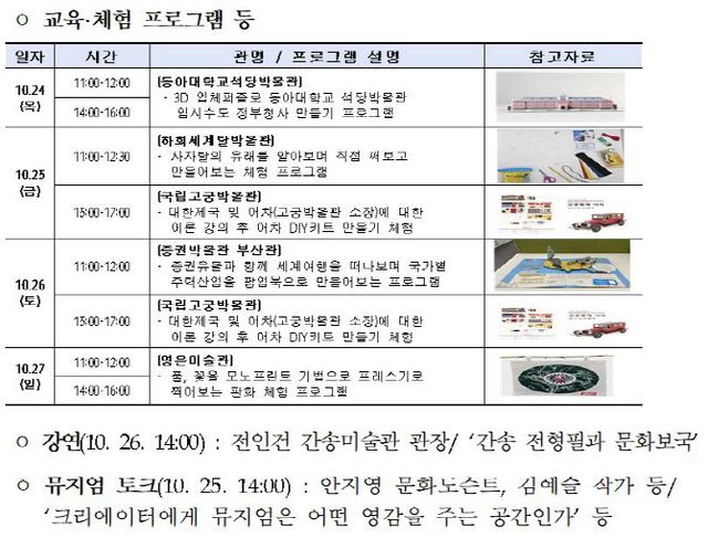 이외에도 참여 기관이 보유한 각종 실감형 콘텐츠와 맞춤형 교육 체험행사 프로그램 등 박물관· 미술관의 매력을 느낄 수 있는 다양한 코너들을 준비했다. 대표 기념품도 만날 수 있다. 국립박물관문화재단은 ‘반가사유상’과 ‘금동대향로’의 작은 모형 등을 선보이고 박람회 마지막 날인 10월 27일에 할인 가격으로 판매할 예정이다.