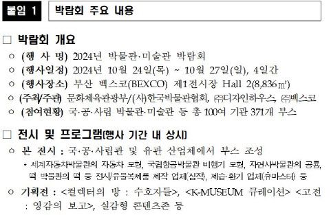 문화체육관광부는 오는 24~27일 부산 벡스코에서 박물관·미술관 박람회를 개최한다고 21일 밝혔다. 기획전시 등 다양한 프로그램을 통해 전국의 박물관·미술관을 널리 알리고 업계 산업 동향을 파악할 수 있도록 돕는 자리다.