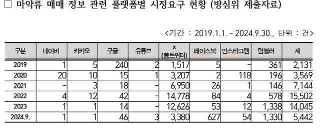 구글의 경우 3분기까지만 집계했는데도 지난해 전체(14건)보다 3배 이상 늘었고 유튜브는 지난 3년간 없었으나 올해 3건이었다. 페이스북의 경우 지난해 53건에서 1083% 증가했고 인스타그램도 지난해 12건에서 4배 이상 는 것이다. 구체적 사례를 보면 마약류나 임시 마약류를 매매한다며 연락처·거래 방법을 게시한 경우가 많았다.