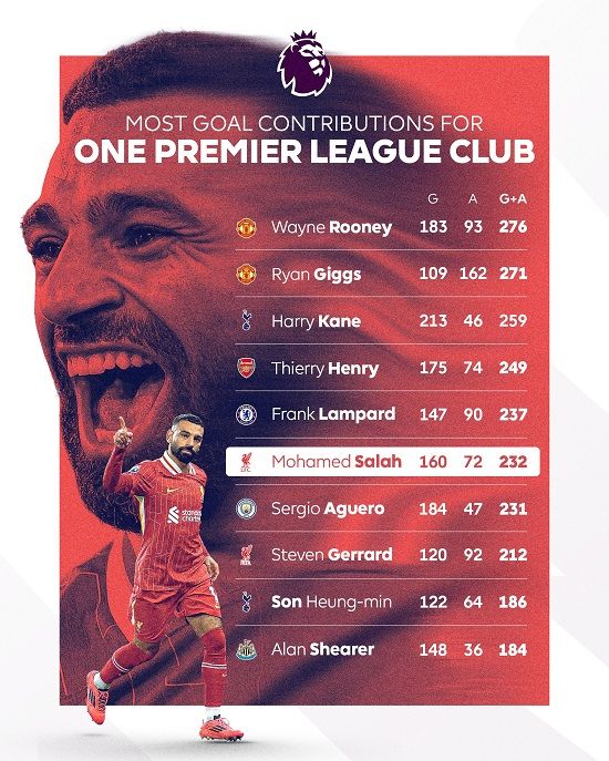 한편, 단일 클럽 최다 공격 포인트 순위를 보면 맨체스터 유나이티드 레전드 웨인 루니가 183골 93도움, 276골에 기여하며 1위에 올랐고, 또 다른 맨유 레전드 라이언 긱스가 109골 162도움으로 총 271골에 기여해 2위에 자리했다. 차례로 해리 케인(259), 티에리 앙리(249), 프랭크 램파드(237), 모하메드 살라(232), 세르히오 아구에로(231), 스티븐 제라드(212) 순으로 뒤를 이었다.