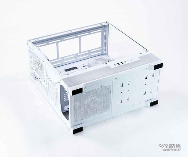 패널을 분리했을 때 지지대가 되는 전체 뼈대는 튼튼하고 정교하다. 정확하고 실용적인 형태로 구성되어 단단하게 전체 무게와 각 조립 요소를 지탱한다. 내부에는 M-ATX, ITX 메인보드 폼팩터를 장착할 수 있다.