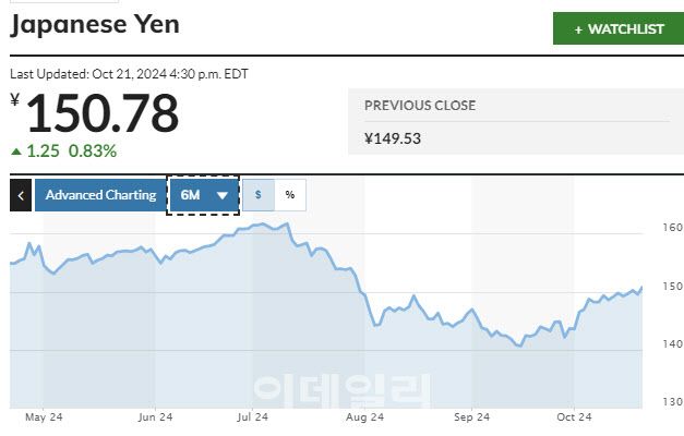 연준의 금리인하 속도가 더뎌질 것이라는 관측에 국채금리가 올랐고 달러가치 역시 이틀 연속 올랐다. 주요 6개국 통화대비 달러가치를 나타내는 달러인덱스는 전 거래일 대비 0.47% 오른 103.98을 기록했다. 달러·엔 환율은 0.86% 급등한 150.81엔까지 치솟았다.
