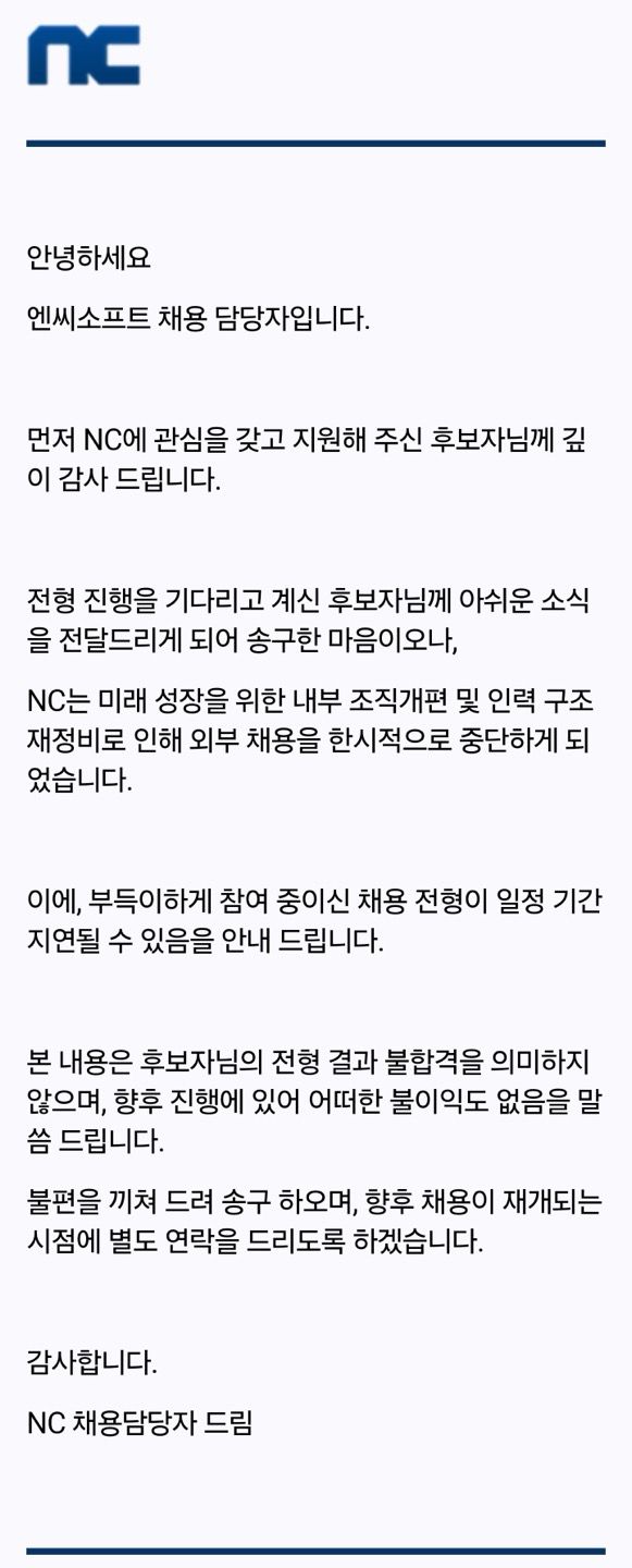 22일 게임업계에 따르면, 엔씨는 전날 채용 신청자들에게 "엔씨는 미래 성장을 위한 내부 조직개편 및 인력 구조 재정비로 인해 외부 채용을 한시적으로 중단하게 됐다"라는 내용의 메일을 보냈다. 엔씨 홈페이지에는 보훈특별채용 안내문만 공지된 상태이며 나머지 채용 공고는 모두 닫혀 있다.